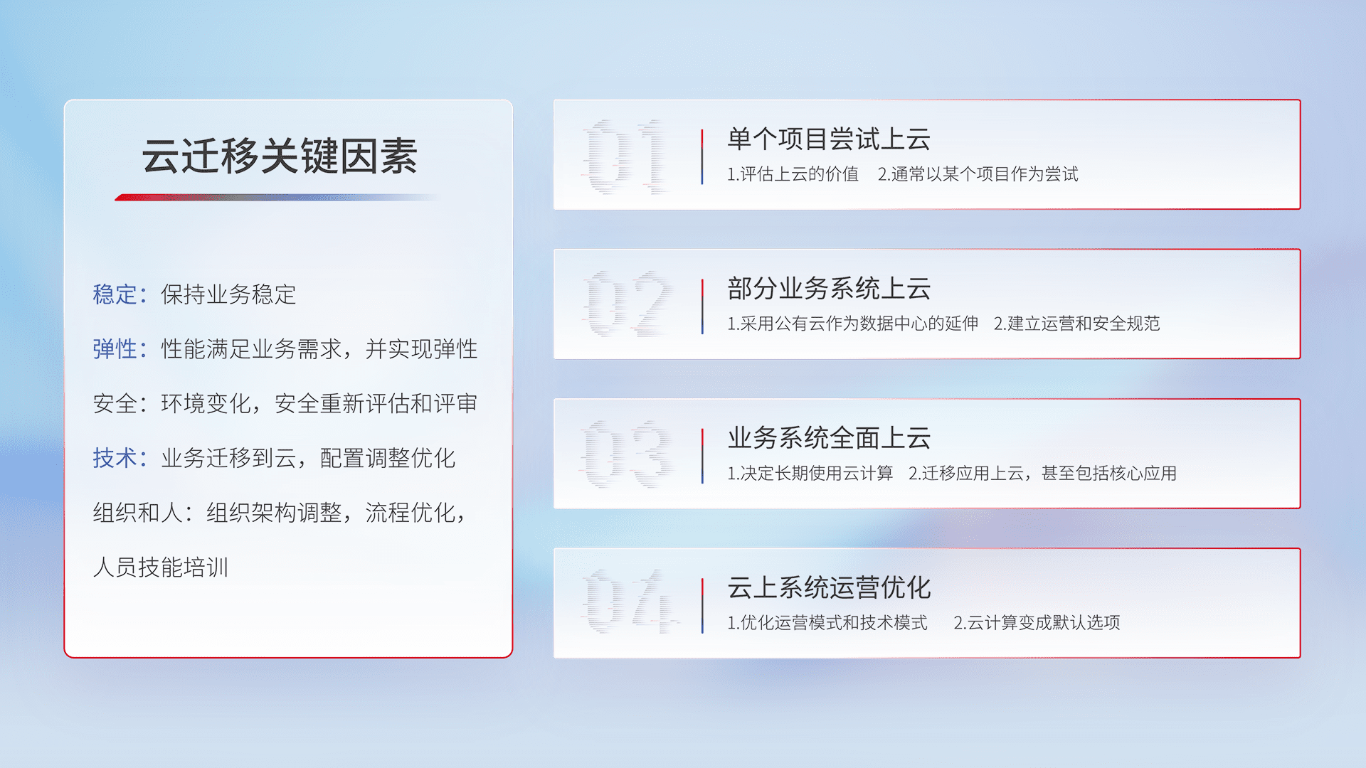结合实际业务,,从规划设计、、、云平台选型、、、云原生改造、、、数据迁移、、、集成交付,,迁移全过程为客户识别最佳上云路径,,做好风险识别管理,,设计网络架构、、、、身份权限、、、安全审计合规、、操作审计、、日志审计、、、、监控告警策略、、多站点容灾设计等,,对云上基础设施进行整体规划,,,,提升IT治理水平,,,,以满足弹性、、、高可用、、、、高性能的需求。。