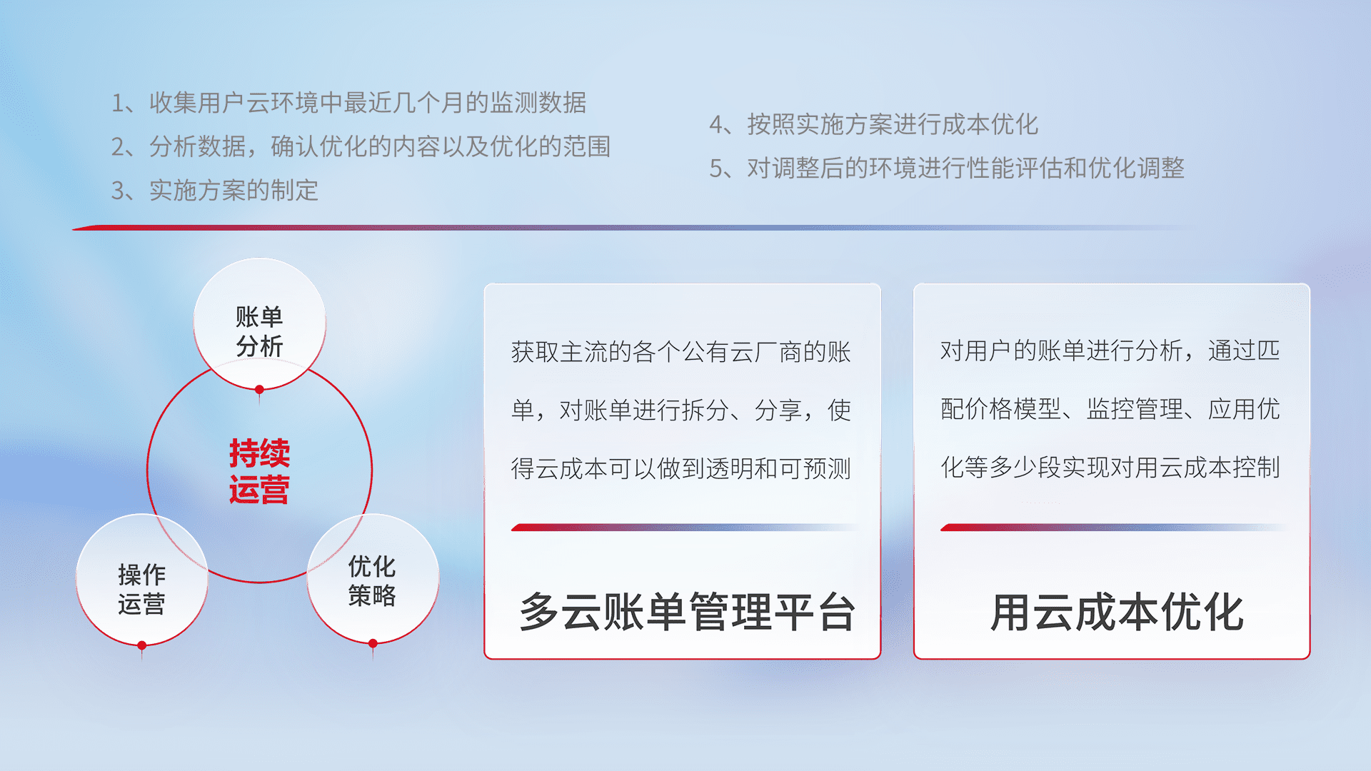 通过多云纳管,,以统一的资源数据模型把客户的云资源进行抽象和封装,,,,进而实现对多云资源的统一操作,,,,保障云资源管理的可靠性、、、稳定性与可用性。。量身定制化运维内容,,配置、、、开发运维、、、、补丁管理、、、、备份、、、、监控、、、、认证和访问管理、、、审计和日常巡检等,,,,保障在用云过程中的可靠度,,稳定度以及高可用率。。。